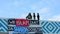Mannen protesteren op dak islamitische school